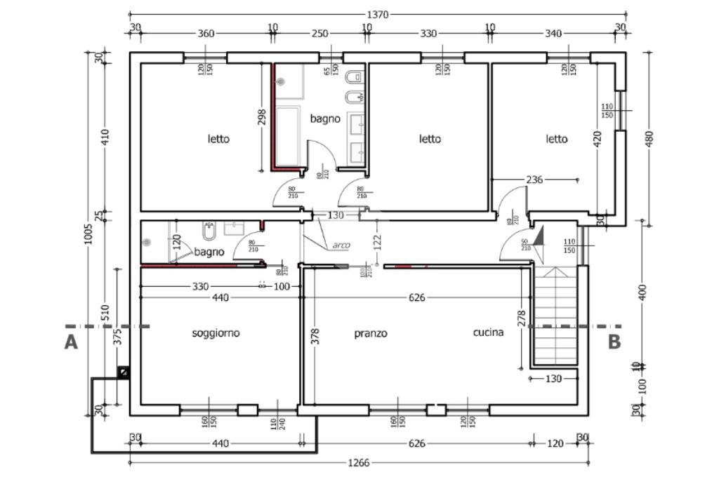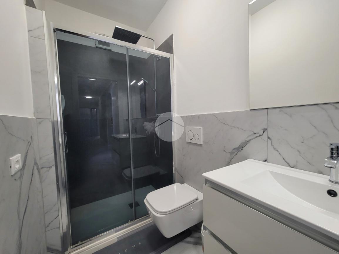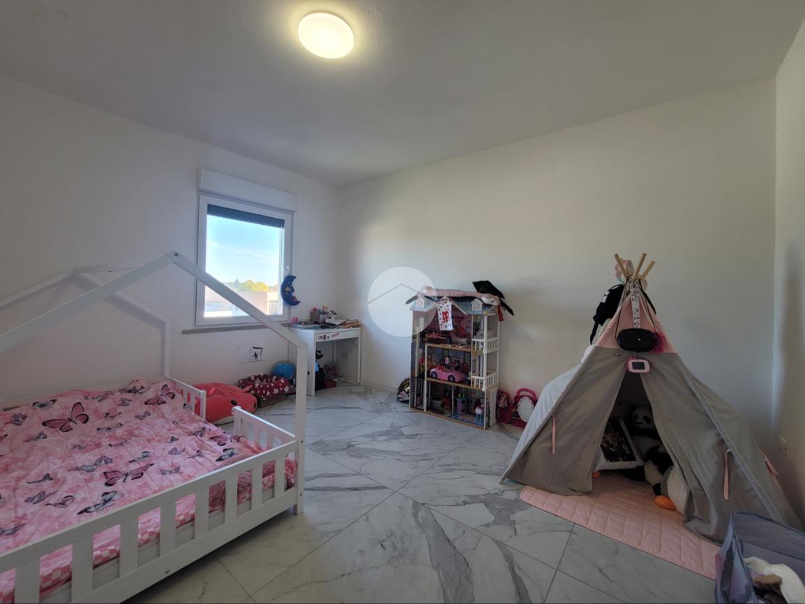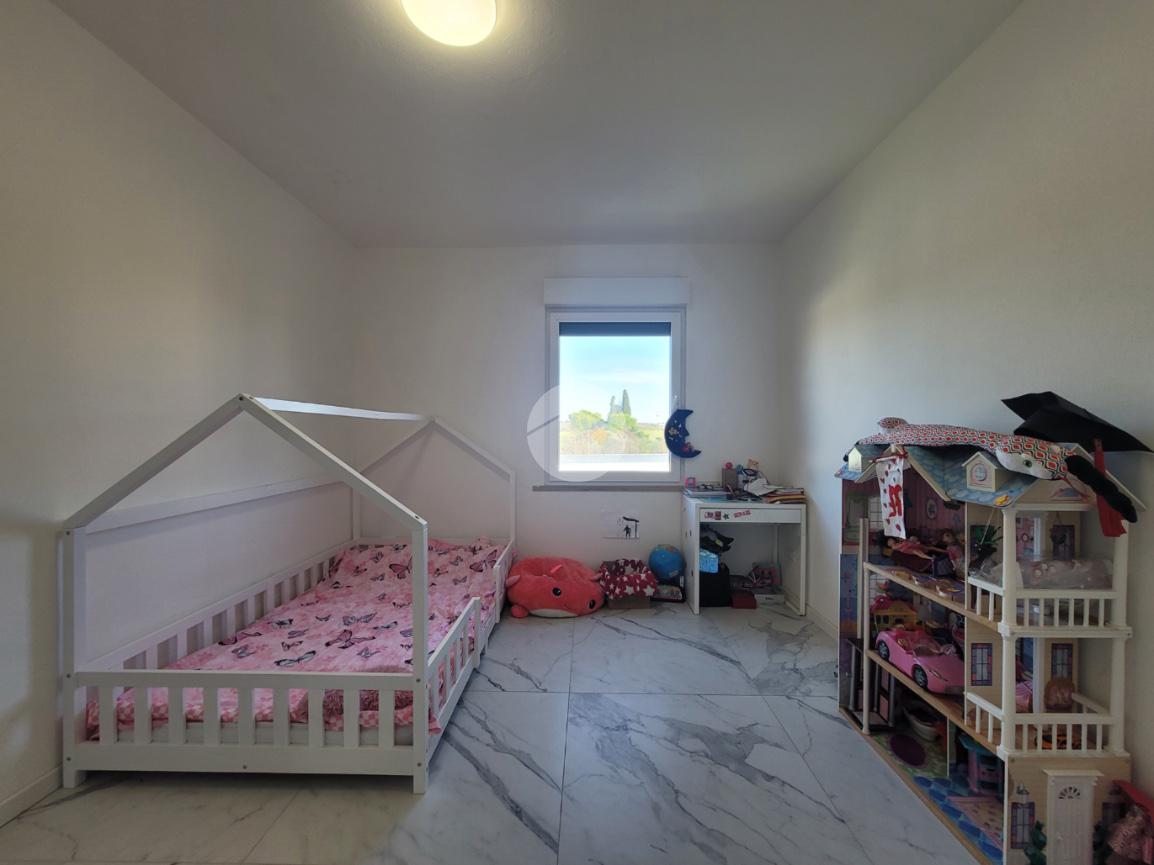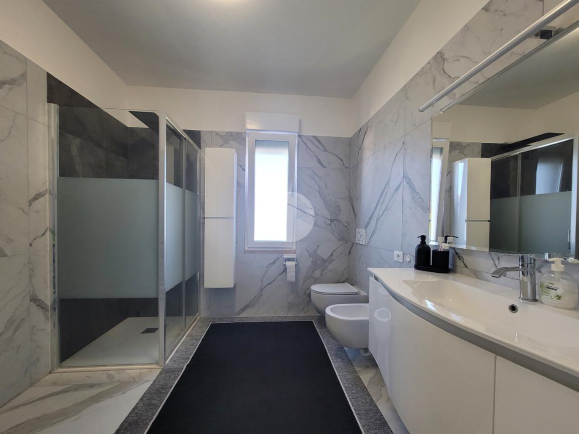 La zona notte offre tre camere da letto matrimoniali e due bagni — uno finestrato e uno cieco, entrambi curati nei dettagli e dotati di moderni sanitari.