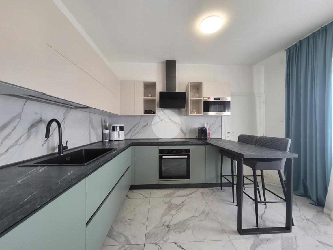 La zona giorno si compone di una luminosa cucina con sala da pranzo e un salotto con balcone separato, perfetto per godersi momenti di relax.